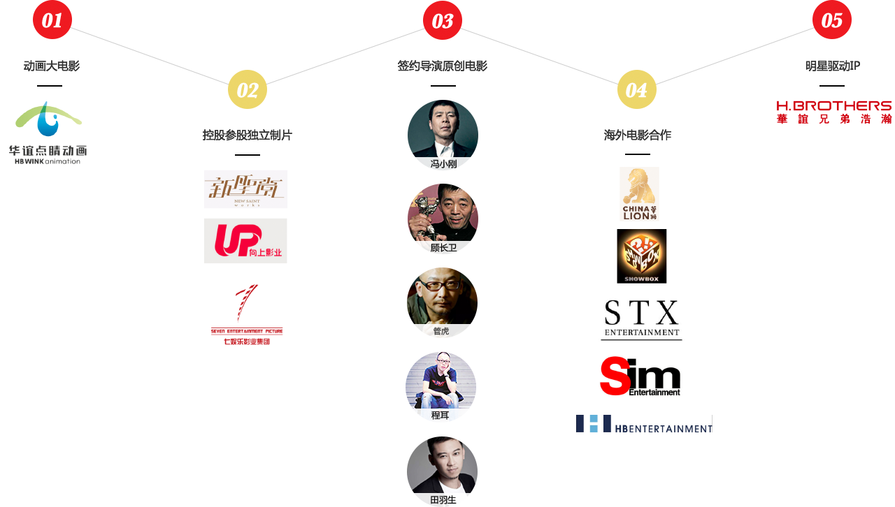 浩瀚娱乐、尊龙凯时 - 人生就是搏!聚星、东阳美拉和尊龙凯时 - 人生就是搏!点睛动画等;以及产量、品质都非常稳定的签约导演团队,如冯小刚、管虎、程耳和田羽生等等。